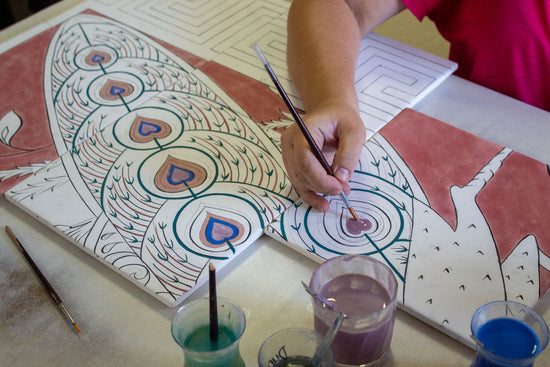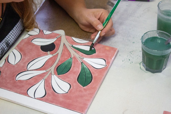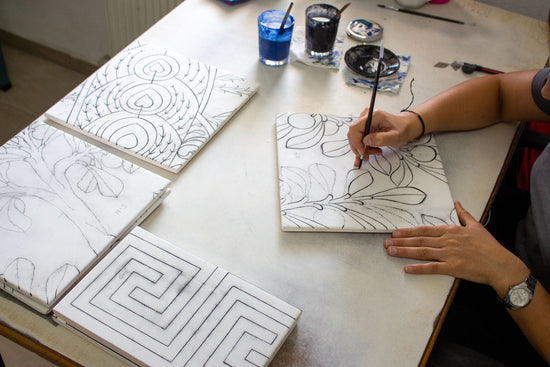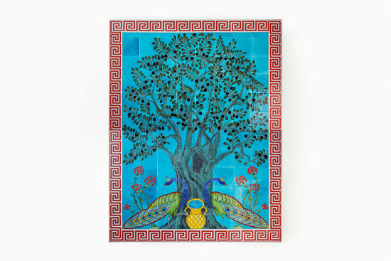 The design’s main theme is the olive tree, one of Iznik’s iconic emblems. At its roots are motifs of the peacock and the water of life, inspired by early Christian iconography. The border features the meander pattern, a motif frequently used in Roman art. The panel was designed by our artist Serap Ereyli.