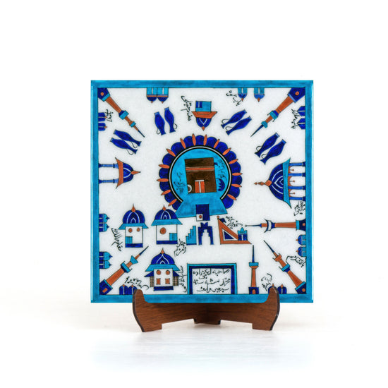 This Iznik tile is the original of the tile located in the Rüstem Paşa Mosque in Istanbul. The Kaaba is depicted in the center, surrounded by the sacred area known as the Masjid al-Haram. The architectural elements around it symbolize important structures in the Islamic world. Prepared in accordance with the original in the language of the Iznik tile tradition, this work presents both a historical and spiritual narrative. Each Iznik tile has been completely handcrafted by master artisans.
