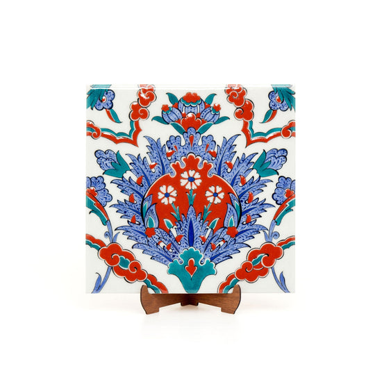 Iznik tiles are delivered in a velvet box along with a wooden or plexiglass stand, while Iznik ceramics are presented in a velvet box.