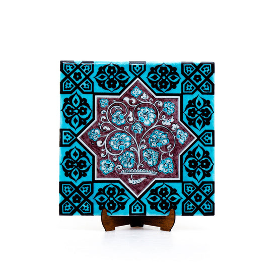Iznik tiles are delivered in a velvet box along with a wooden or plexiglass stand, while Iznik ceramics are presented in a velvet box.