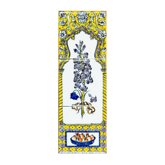 Ali Üsküdari üslubunu yansıtan bu çini pano, tek gövdede yükselen sümbül motifiyle zarafeti ve ruhsal arınmayı simgeler. Alt kısımdaki meyve tasviri bereket temasını güçlendirirken, eserin genel yapısı geleneksel çini sanatında estetik ve anlamı dengede sunar. Her bir İznik çinisi, usta zanaatkarlar tarafından tamamen el işçiliğiyle üretilmiştir.