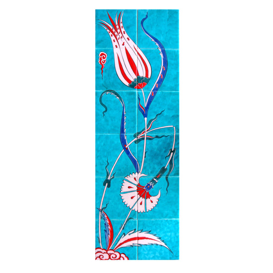 Beyaz Lale ve Karanfil İznik Çini Pano, Osmanlı döneminin zarif çini sanatını yansıtan lale ve karanfil motifleriyle süslenmiştir. El işçiliğiyle üretilen bu pano, klasik desenleri modern dekorasyonla buluşturarak mekanlara estetik bir dokunuş kazandırır. Geleneksel sanatın en ince detaylarını yansıtan özgün bir tasarımdır. Desen tasarımı Serap Ereyli ve İznik Mavi Çini'ye aittir.