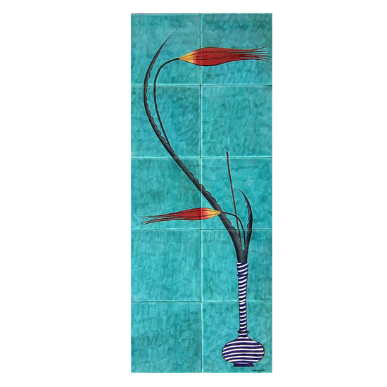 Sadelikten gelen zarafeti yansıtan bu çini pano, uzun gövdeli iki lale motifiyle biçimlenmiştir. Kompozisyon, geleneksel sanatta “çeşm-i bülbül” olarak anılan, bülbülün bakışı kadar ince ve duygulu çizgilerin estetik bir yorumudur. Dinginliği ön plana çıkarır. Desen düzenlemesi Serap Ereyli ve İznik Mavi Çini'ye aittir.