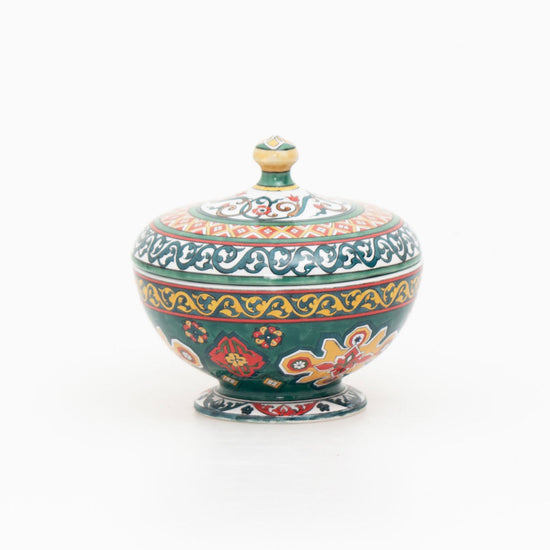 Geleneksel motiflerin güçlü bir yorumuyla hazırlanan bu İznik çinisi şekerlik, etnik desenleri ve zengin renkleri ile dikkat çekiyor. Sanatsal detaylarıyla sofralarınıza estetik bir hava katan bu çini şekerlik, işlevselliği ve dekoratif özelliğiyle ön plana çıkıyor.