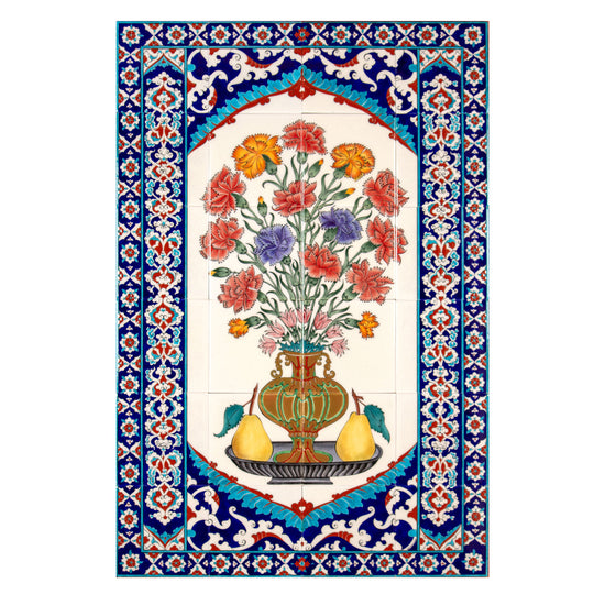 Hasbahçe Karanfilleri İznik Çini Pano, Osmanlı döneminde saray süslemelerinde sıkça kullanılan karanfil motiflerini İznik çini sanatıyla buluşturuyor. Sarayın Hasbahçe’sindeki çiçek desenlerinden ilhamla üretilen bu eser, geleneksel sanatın modern bir yansımasıdır. Desen tasarımı Serap Ereyli ve İznik Mavi Çini'ye aittir.