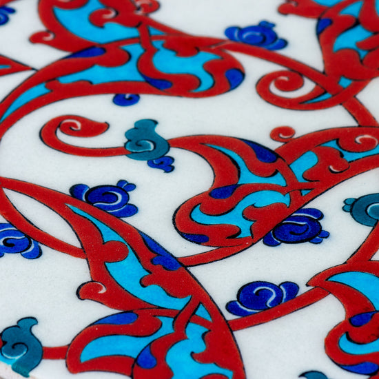 Hurde Rumi olarak adlandırılan bu motif, rumi desenlerinin daha ince ve zarif dallarla işlendiği, Osmanlı çini sanatında sıkça rastlanan bir süsleme stilidir. Klasik rumi formunun dinamik bir yorumu olan bu desen tasarımı Serap Ereyli ve İznik Mavi Çini'ye aittir. Her bir İznik çinisi, usta zanaatkarlar tarafından tamamen el işçiliğiyle üretilmiştir.