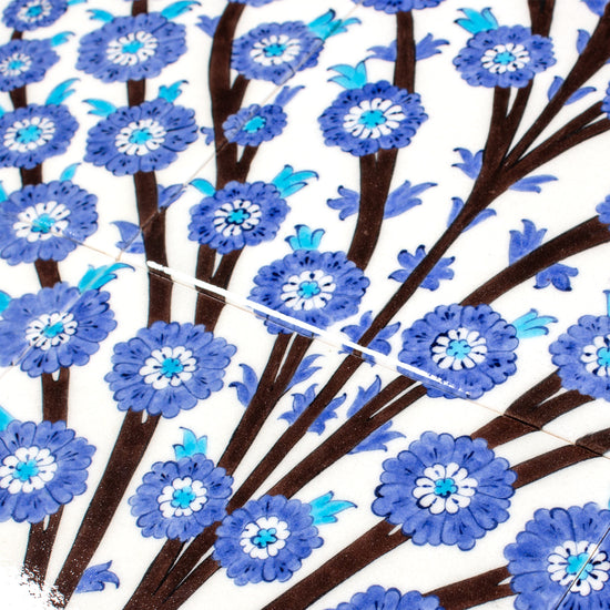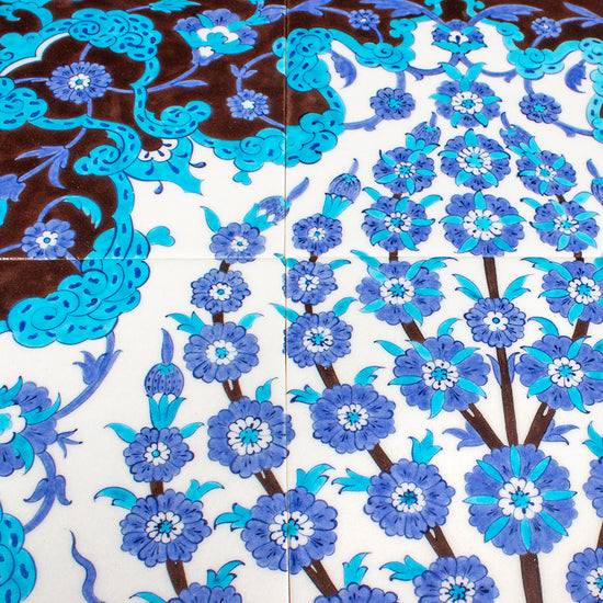 Osmanlı çini sanatında önemli bir yeri olan “Hayat Ağacı” motifi, bu panoda zarif ve dengeli bir kompozisyonla yorumlanmıştır. Köklerinden yukarıya doğru simetrik biçimde uzanan stilize dallar, yaşamın sürekliliğini ve ruhsal yükselişi simgeler. Alt ve üst bölümlerde yer alan klasik çiçek motifleri, kompozisyonu zenginleştirerek bütünsel bir estetik sunar. Bu desenin orijinali, Şehzade Yusuf İzzeddin Köşkü’nün iç mekân süslemelerinde yer almaktadır. Her bir İznik çinisi, usta zanaatkarlar tarafından tamamen el işçiliğiyle üretilmiştir.