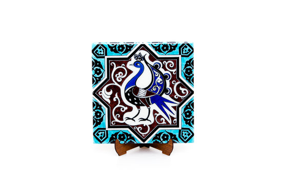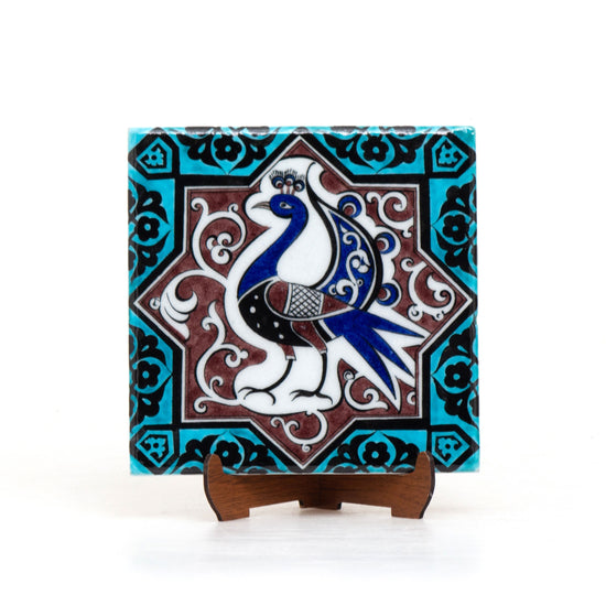 Selçuklu sanatında zarafetin ve bilgeliğin sembolü olarak kullanılan tavuskuşu motifi, geleneksel İznik çini teknikleriyle bir araya getirilerek sanatsal bir duvar dekorasyonu oluşturuyor.