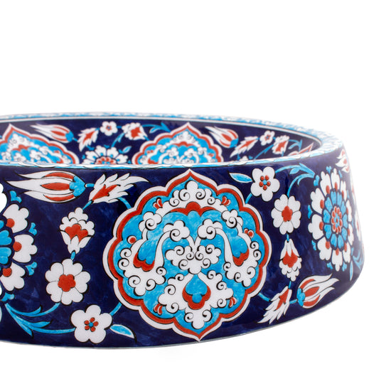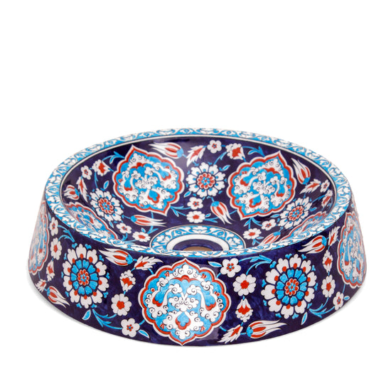 Geleneksel Şems motifleriyle süslenmiş bu İznik çini lavabo, Osmanlı sanatının en özel tasarımlarından biridir. Güneşi ve aydınlanmayı simgeleyen desenleri, mekâna mistik bir atmosfer kazandırırken sanatsal detaylarıyla da dikkat çekiyor. Klasik ve dekoratif sanatın ustalıkla birleştiği bu lavabo, banyolarınıza tarihi bir dokunuş katıyor. Desen tasarımı Serap Ereyli ve İznik Mavi Çini'ye aittir.