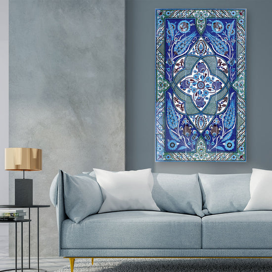 Bu özgün tasarım, Şam işi dönemine ait motifler ile Babanakkaş üslubunun zarif çizgilerini birleştirerek oluşturulmuştur. Kompozisyonun merkezinde yer alan düğüm motifi, geçmişten günümüze sürekliliği simgelerken; çiçek motifleri ve simetrik düzen, klasik Osmanlı estetiğini modern bir bakışla yeniden yorumlamaktadır. Tasarım Serap Ereyli ve İznik Mavi Çini’ye aittir.