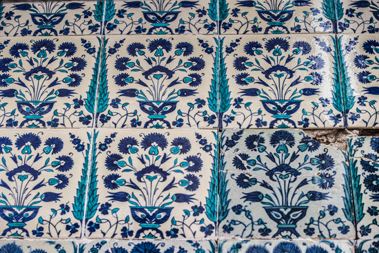 Bu tasarım, İstanbul’daki Yeni Camii’nin orijinal çini dekorasyonunda yer alan klasik bir çiçek vazosu kompozisyonudur. 2020 yılında yapılan restorasyon kapsamında çinileri İznik Mavi Çini tarafından üretilmiştir. Simetrik yerleşimi, karakteristik lale, sümbül ve karanfil çiçekleriyle Osmanlı dönemi bezeme sanatının zarafetini yansıtır.